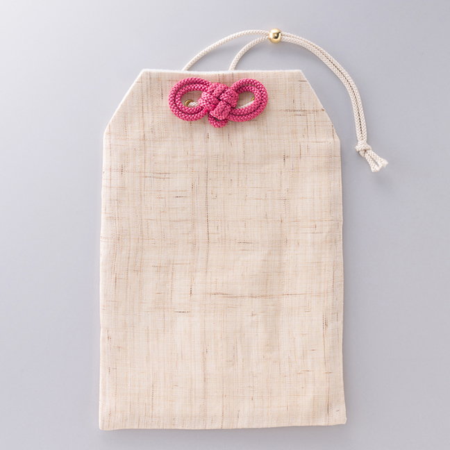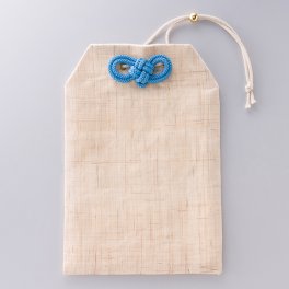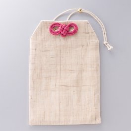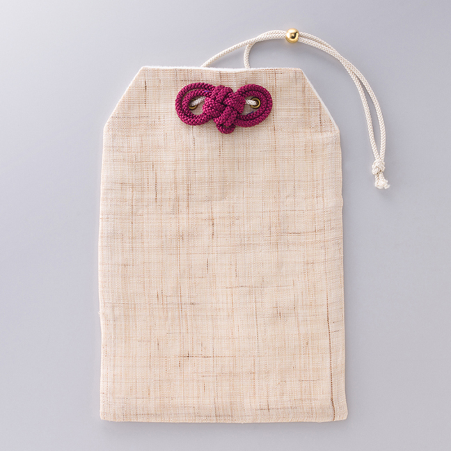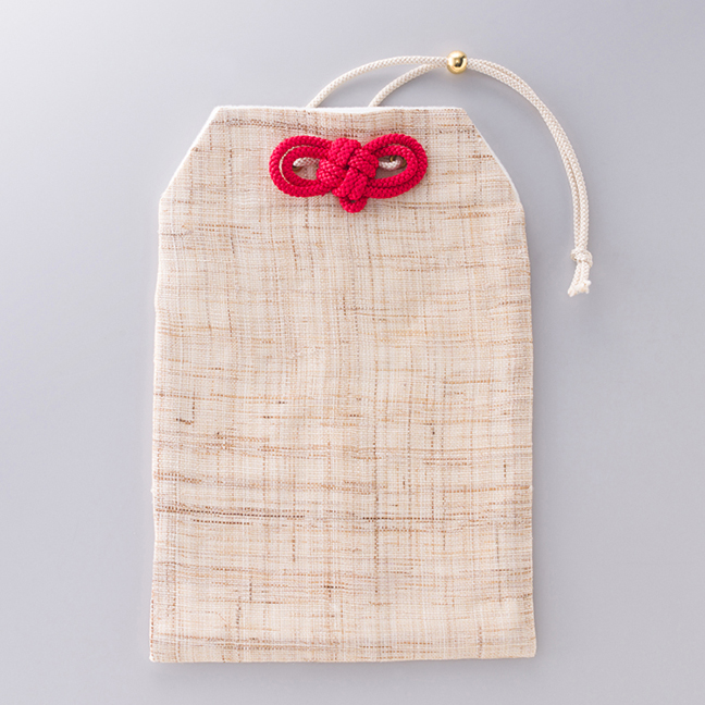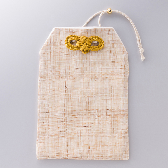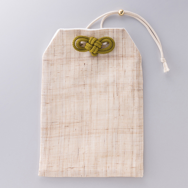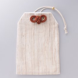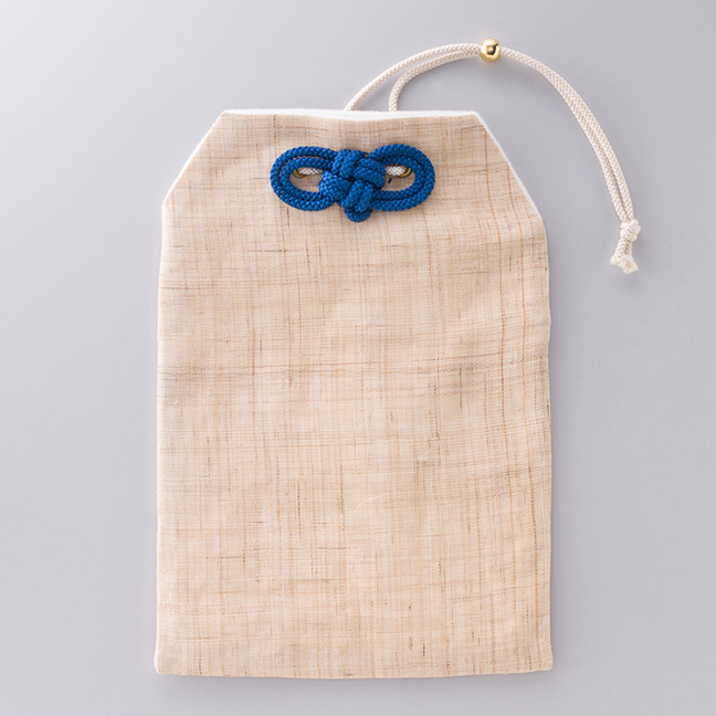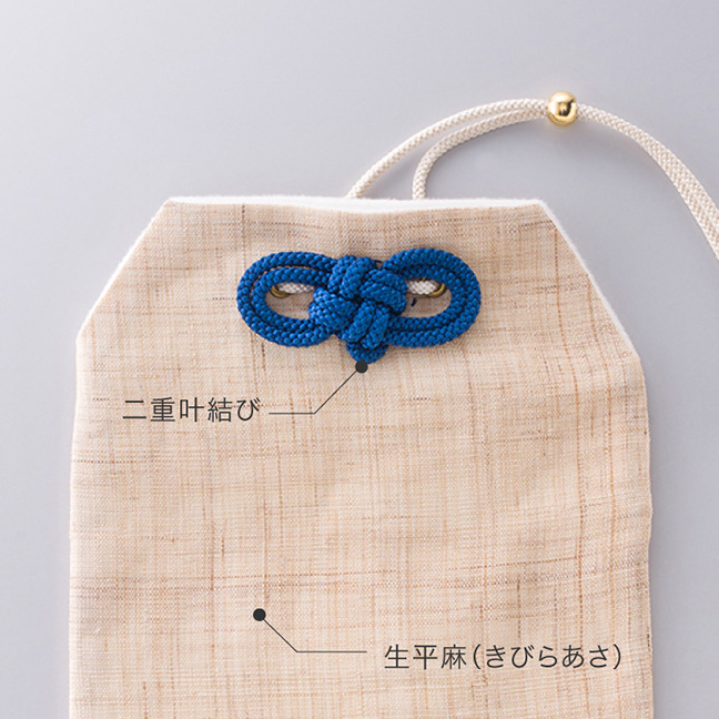 神聖な生平麻(きびらあさ)を使ったお守り型の袋に、願いが叶うという意味がある二重叶結びが施されていて、大変縁起のよいユーモアのあるデザインになっています。