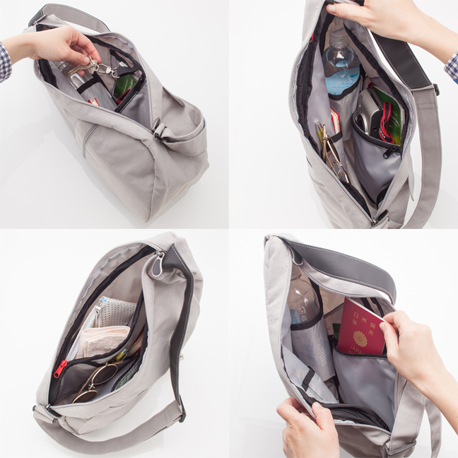 肩に掛けたまま、ぐるっと回せば物の出し入れも簡単。