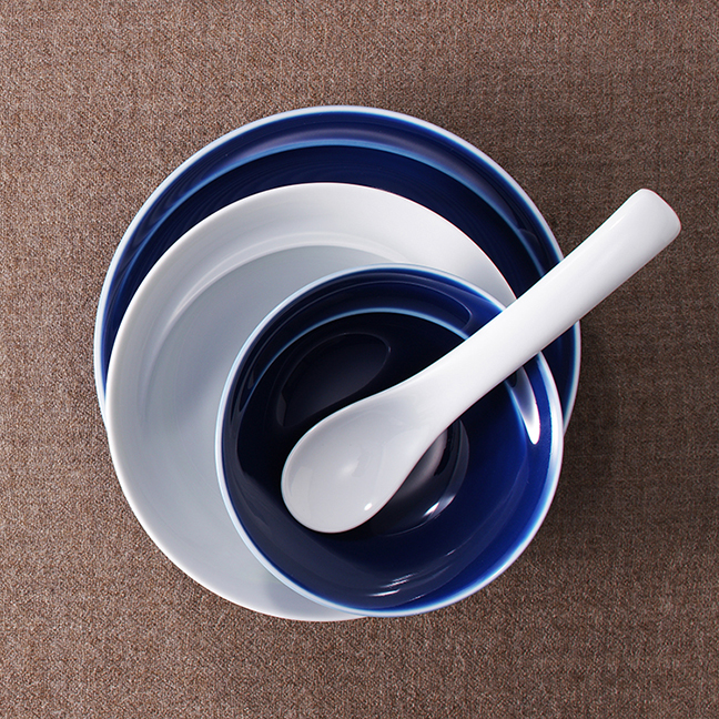 「すくいやすさ」を求めながらも、日常のシーンでのほかの食器との調和を心がけ、部分的な反り返りの「弧」が、円の中にふわりと浮かび上がり、機能的でありながら視覚的にも美しい食器が出来上がりました。