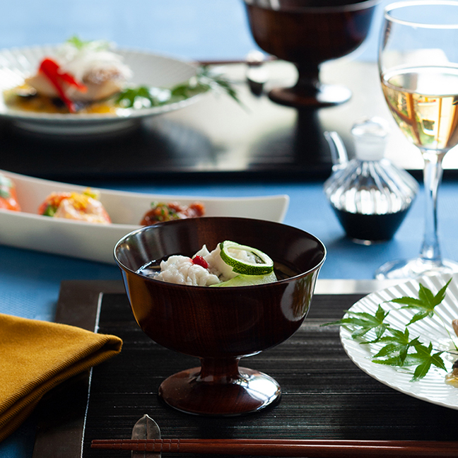 手に伝わる熱を優しく、天然木と漆のお椀。お椀に足があるため、手を差し込んで簡単に持つことができます。