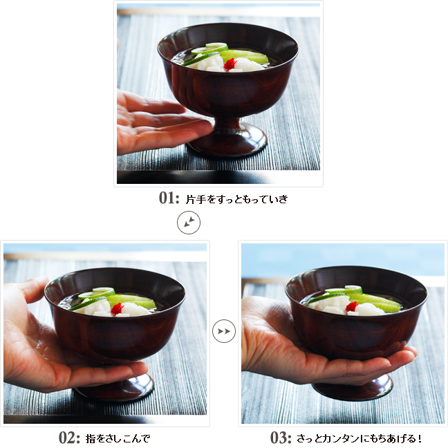 このお椀には足があるため、この足部分に手をそのままの差し込むだけで、簡単にお椀を持ち上げることができます。