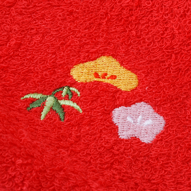 紅白のタオルには、「松竹梅」と「鶴亀」のワンポイント刺繍が入っています。