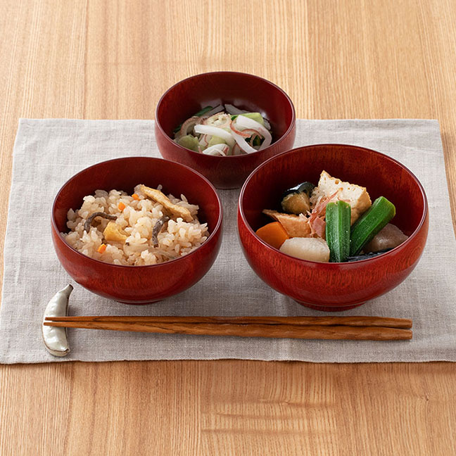 お椀は、お茶碗と違い、直接口をつけてお味噌汁等を飲む為、しっかりと手の中に収まるようにデザインされていて、お味噌汁も飲みやすく、箸を使って具も食べやすいです。