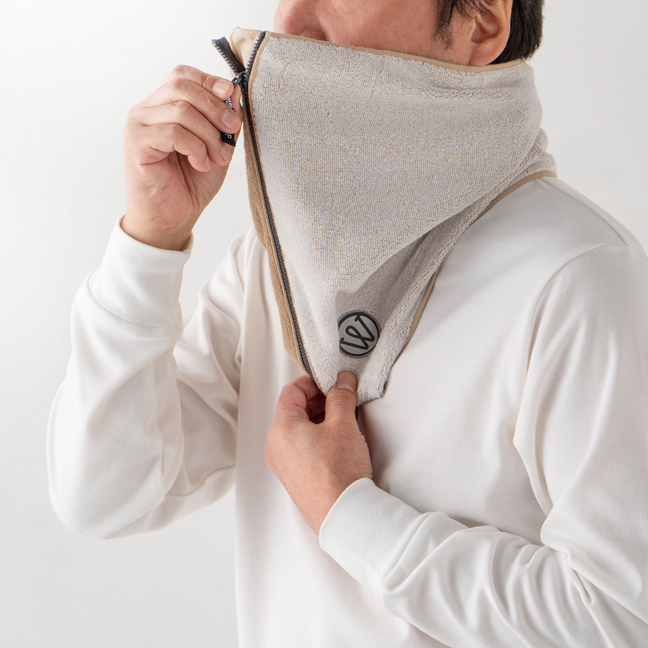 ジッパーを閉めれば、ネックゲーター(ネックウォーマー)に、外せば、フェイスタオルに。
